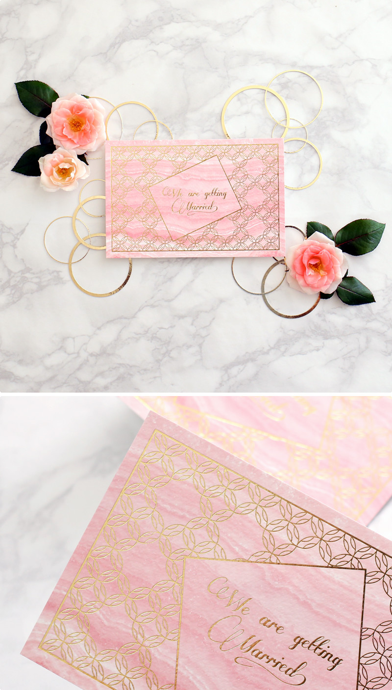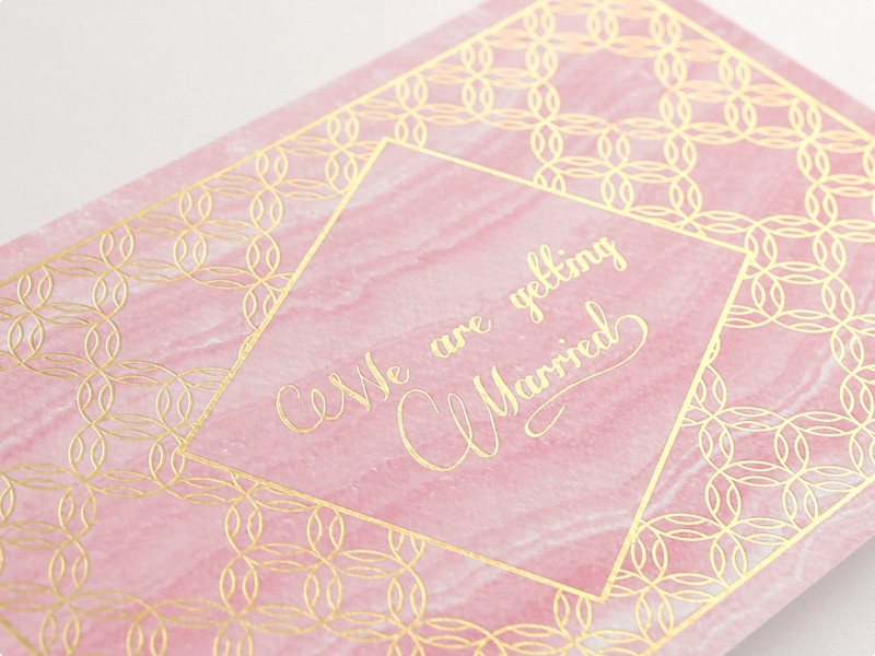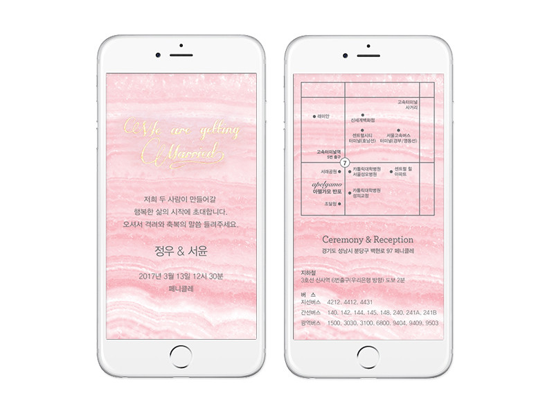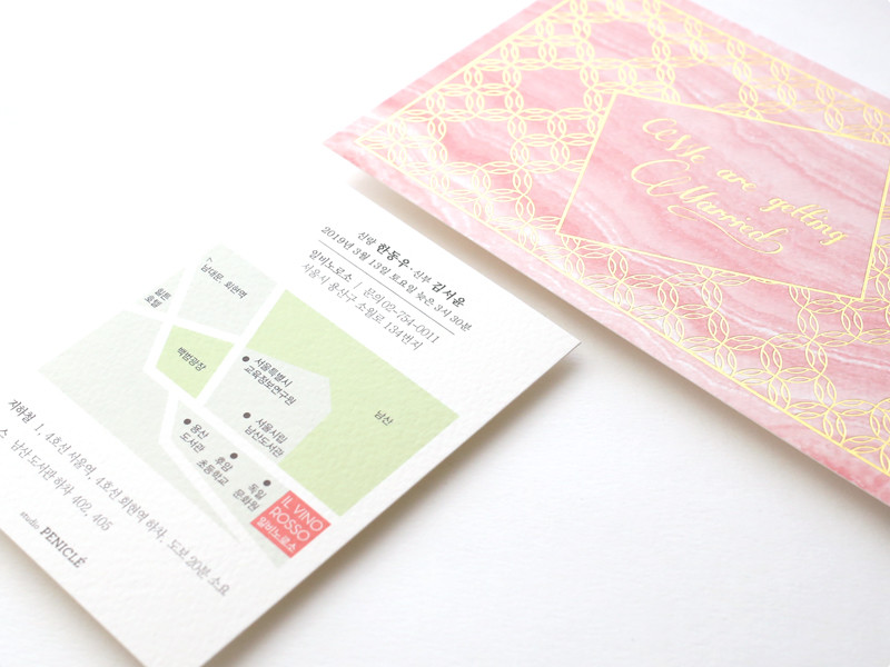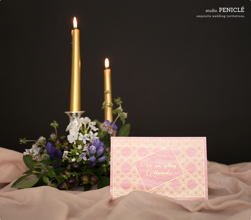 고운 장미빛의 마노(agate) 단면에 잔잔한 골드체인이 어우러진 우아한 웨딩카드입니다.
