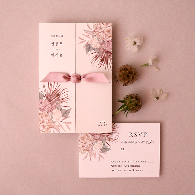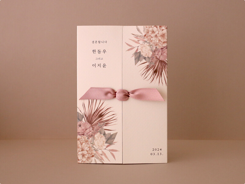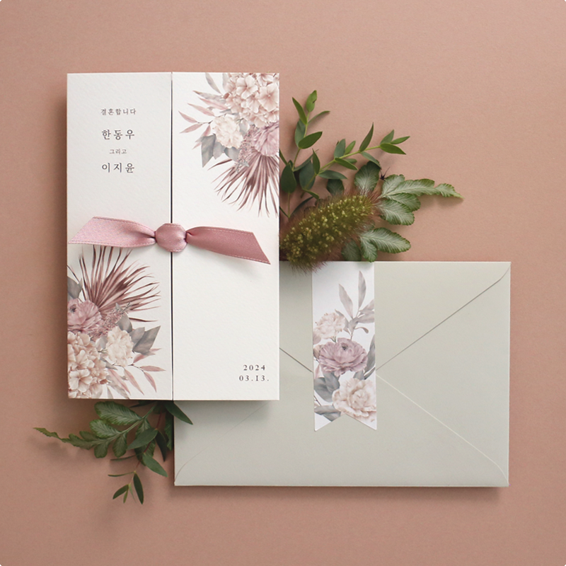 보헤미안 컨셉의 모티브와 컬러를 담은 리본 청첩장입니다.